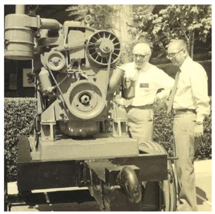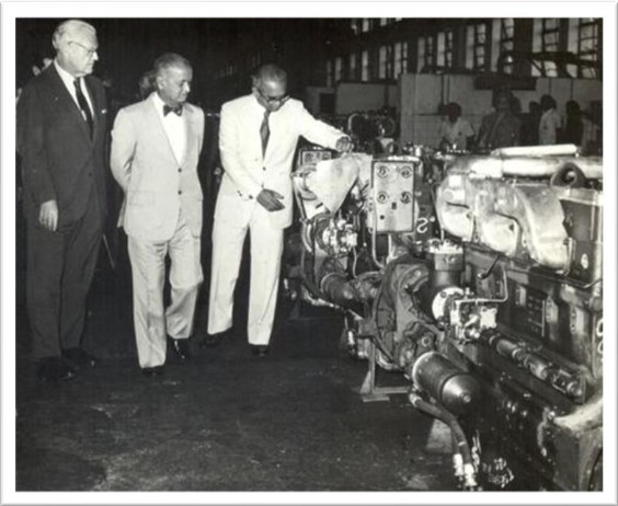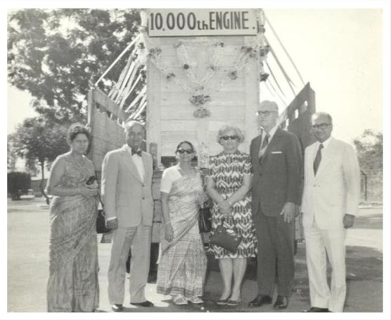 Suman Kirloskar, Shantanu Kirloskar, Yamutai Kirloskar, Xenia Simons Miller, J. Irwin Miller and Chandrakant Kirloskar pictured above, rolling out the 10,000th Kirloskar Cummins Engine.